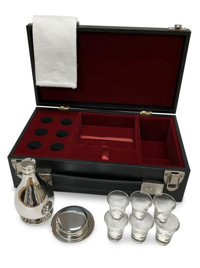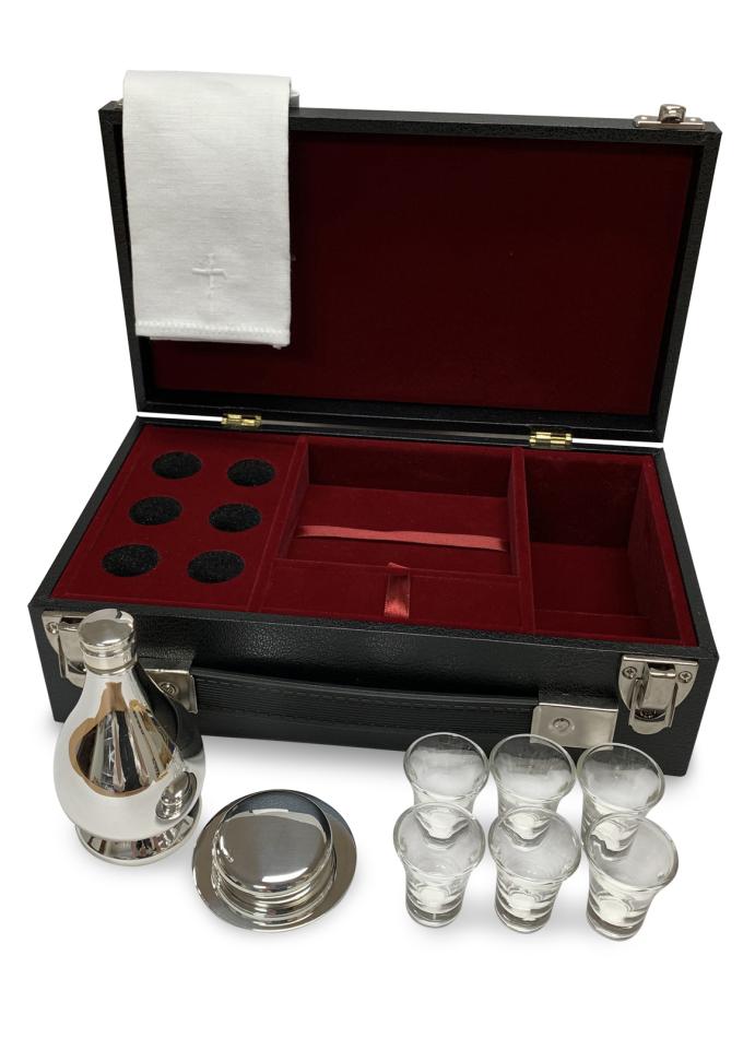 Silver plated, contains bread paten with lid, 6 tot glasses with a metal cruet and purificators.