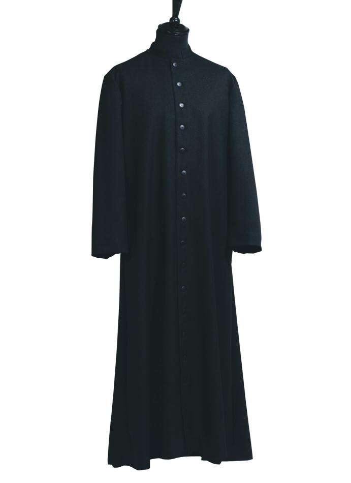 Single breasted cassock made with unlined polyester. Adult size. Length 58" Sleeve Length 24 1/2"