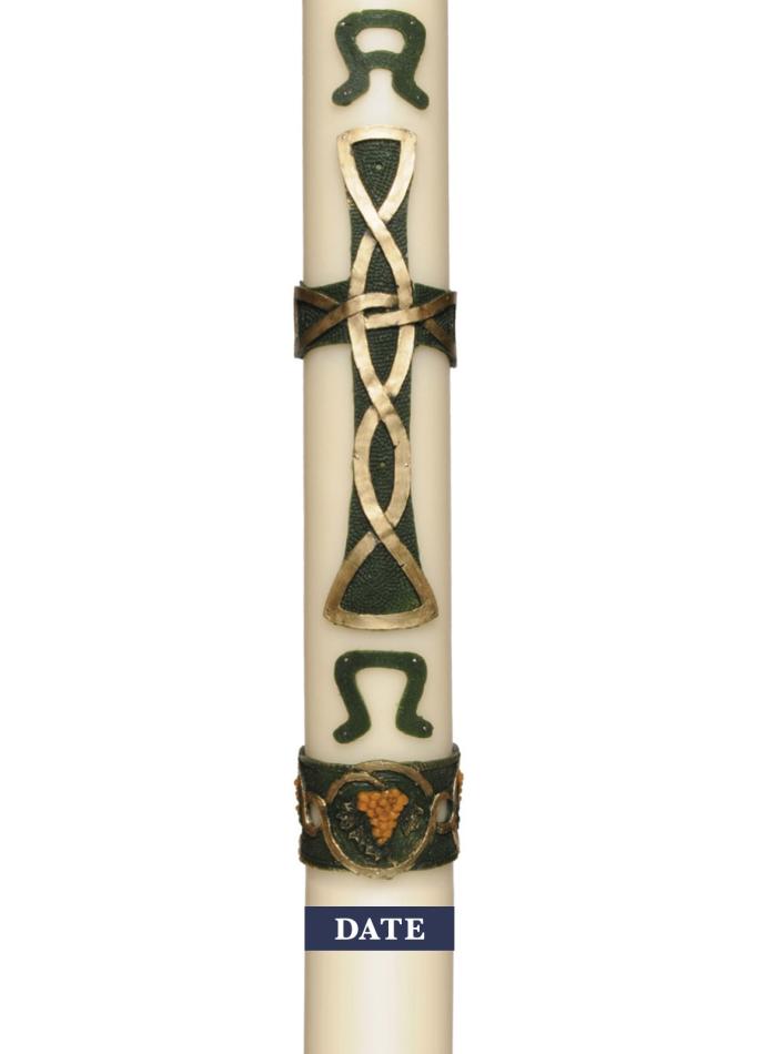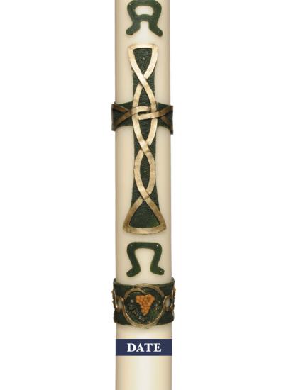 Celtic Cross & Grapes Green Design (Suitable for 2 1/2" - 3" Candles) PLEASE NOTE DATES ARE EITHER SIDE OF CROSS NOT ON A DATE STRAP