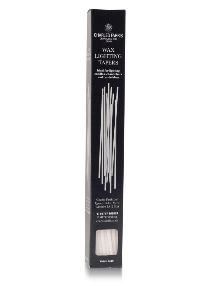 Charles Farris lighting tapers,approx 55 per box and 12" long. Matches can drop debris into the candle, affecting the quality of the burn.