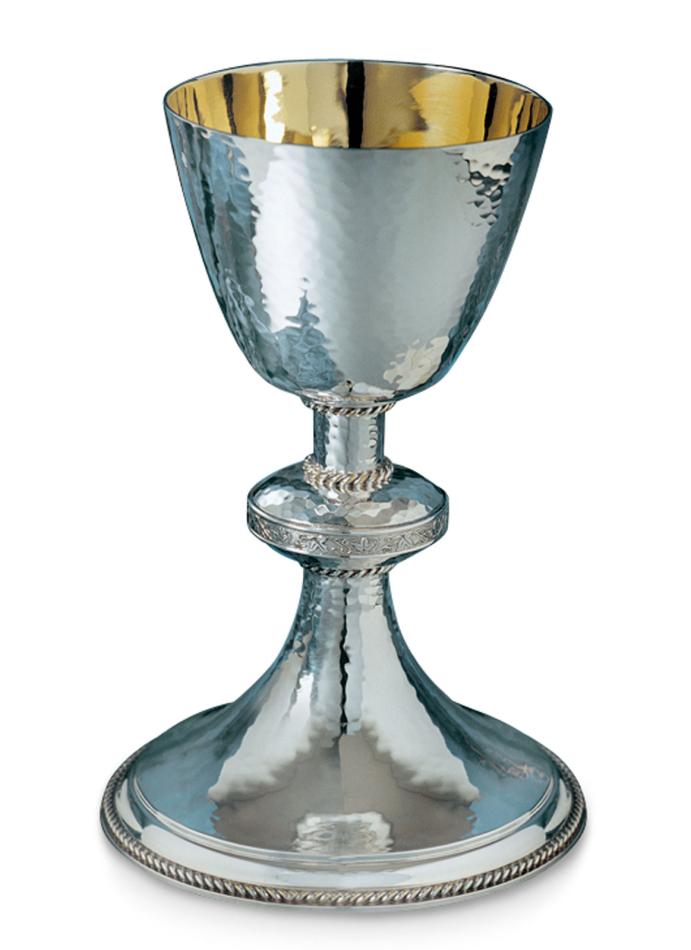 St Augustines Chalice S/P This fine chalice with hammered bowl and 22ct gold plated interior,with an intricately detailed knop with rope design on te stem and base,is available in hallmarked sterling silver or silver plate a matching scale or well paten is also available. Height 8" Capacity 12 fl oz